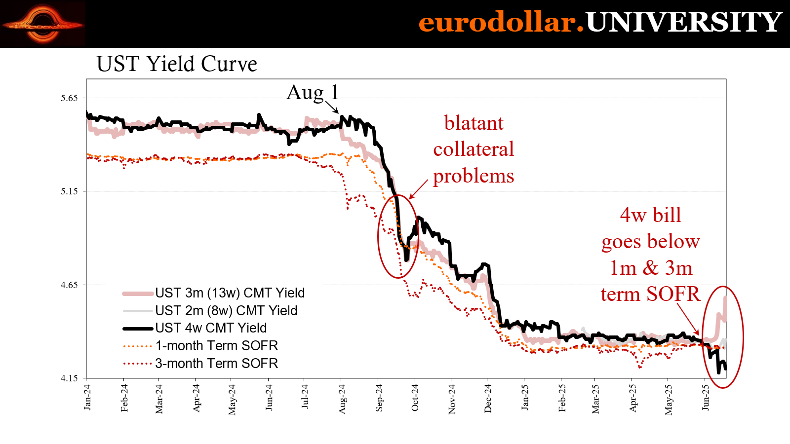 What if this had come up last summer? As it was, we saw collateral conditions quickly devolve to the point the 4w bill yield was falling fast, eventually even getting under comparable rates (like term SOFR) by mid-September. Had there been fewer bills issued then plus problems with some of the maturities, like the 8w currently, all that surely would have escalated all those monetary difficulties at a particularly weak spot for the markets and the economy.