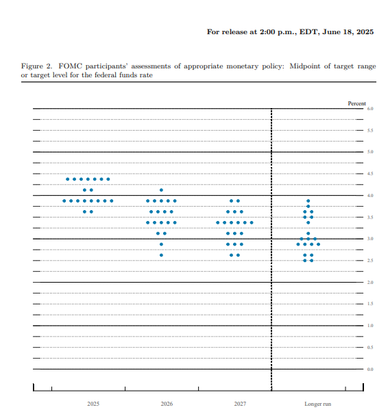 While some dots shifted according to today’s update from the FOMC, if there is anything worth taking away from the quarterly projections (updated from March) it’s that the models are getting weakness on the economy side even if blaming tariffs for it. No matter, GDP projections are now down firmly in the danger zone Powell says he doesn’t see.