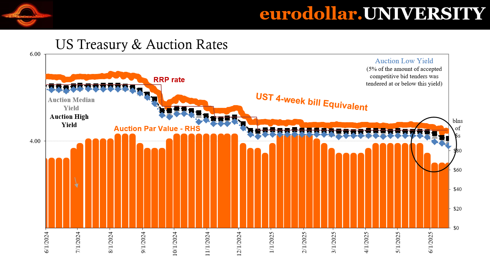 As a consequence, demand for other bills typically rises and we see that at the 4w. Moving opposite its cousin, the other bill today yields just 4.20% following its auction of $65 billion which produced a high rate of only 4.06%. I had already pointed out how, before all this, the 4w yield had been moving lower and had, in fact, breached the RRP “floor” (briefly) back on June 5 before this latest debt ceiling matter came about.