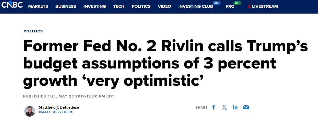 Remarking to CNBC on the budget proposal, former Federal Reserve Vice Chairman Alice Rivlin stated the issue perhaps as well as might be expected. With respect to these expectations for economic vitality, she said very simply, “We haven’t seen 3 percent growth for a long time.”