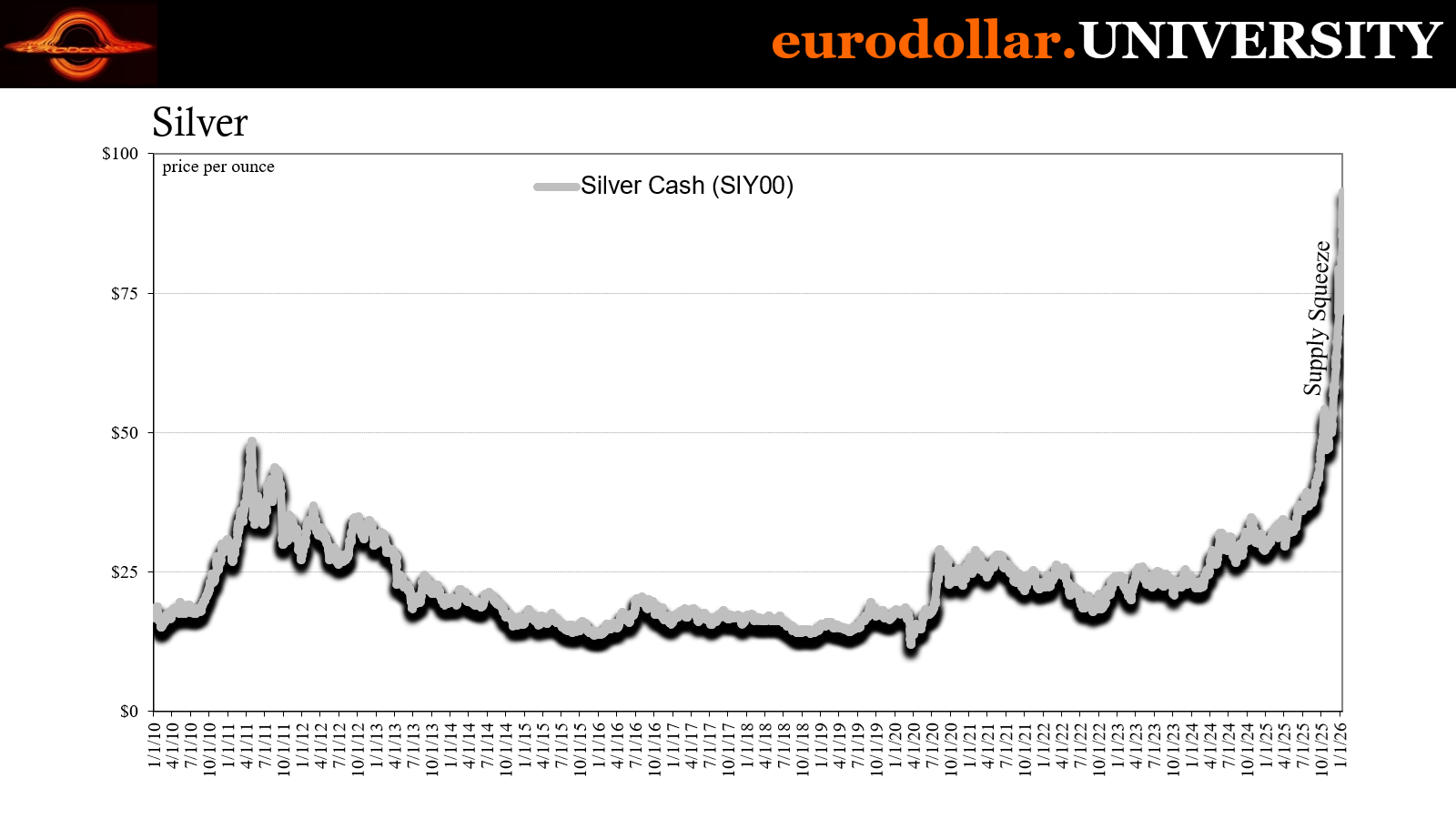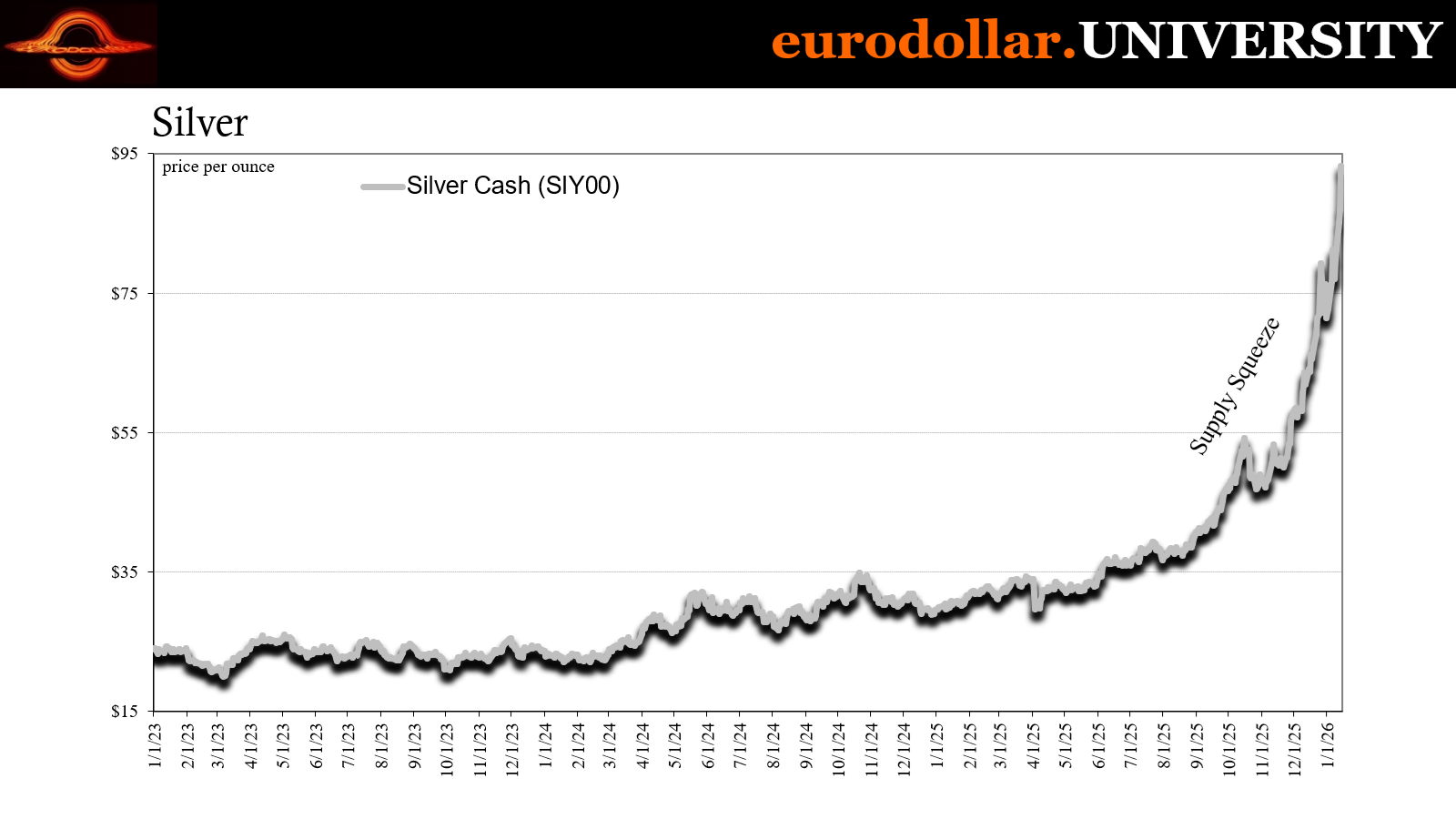 There is no universe in which a commodity price goes straight up – not even parabolic, literally straight up – and it ends well for that commodity and any interpretation of its rise that suggests it is real and permanent. Silver’s epic squeeze continues to run, putting the metal yesterday above $93 for the first time and raising the rate of return (in dollars) to 222% since the final days of 2024 when the trend got going.