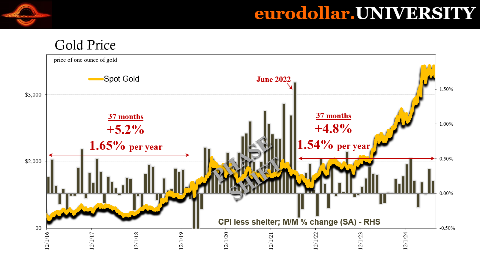 And, yes, this extends all the way into the 2020s. You only need to see the price of gold matched against the CPI to see what exactly I mean (or against the US dollar exchange value, even faulty DXY). Gold was rising sharply from the middle of 2018 back when the already-disinflationary 2010s were about to get even more so.
