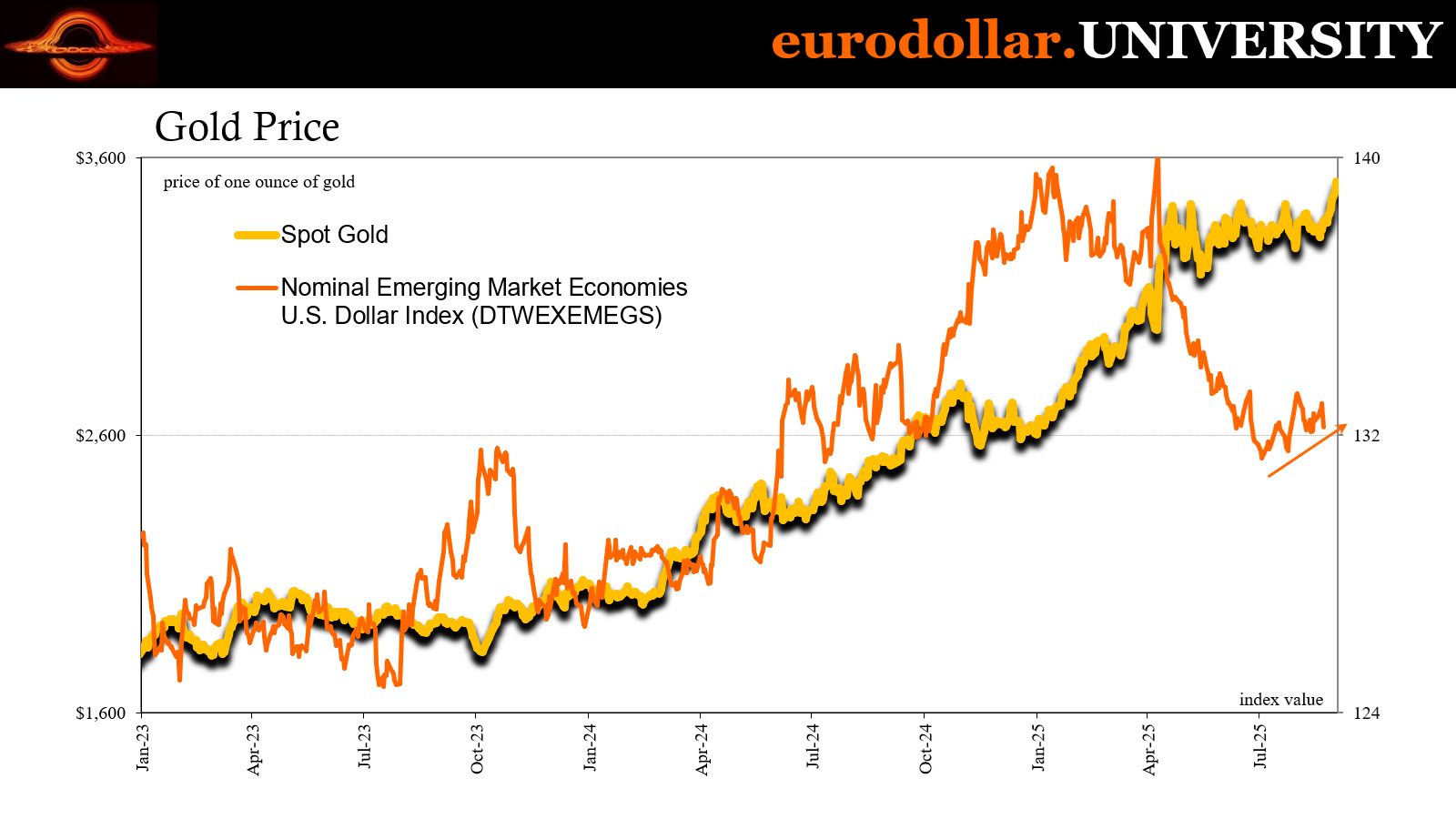 The latter is why gold began to surge starting in October 2023 – coincident to the bond rally. Again, deflation potential drives gold, a rising dollar world rather than inflation and “sell America.”