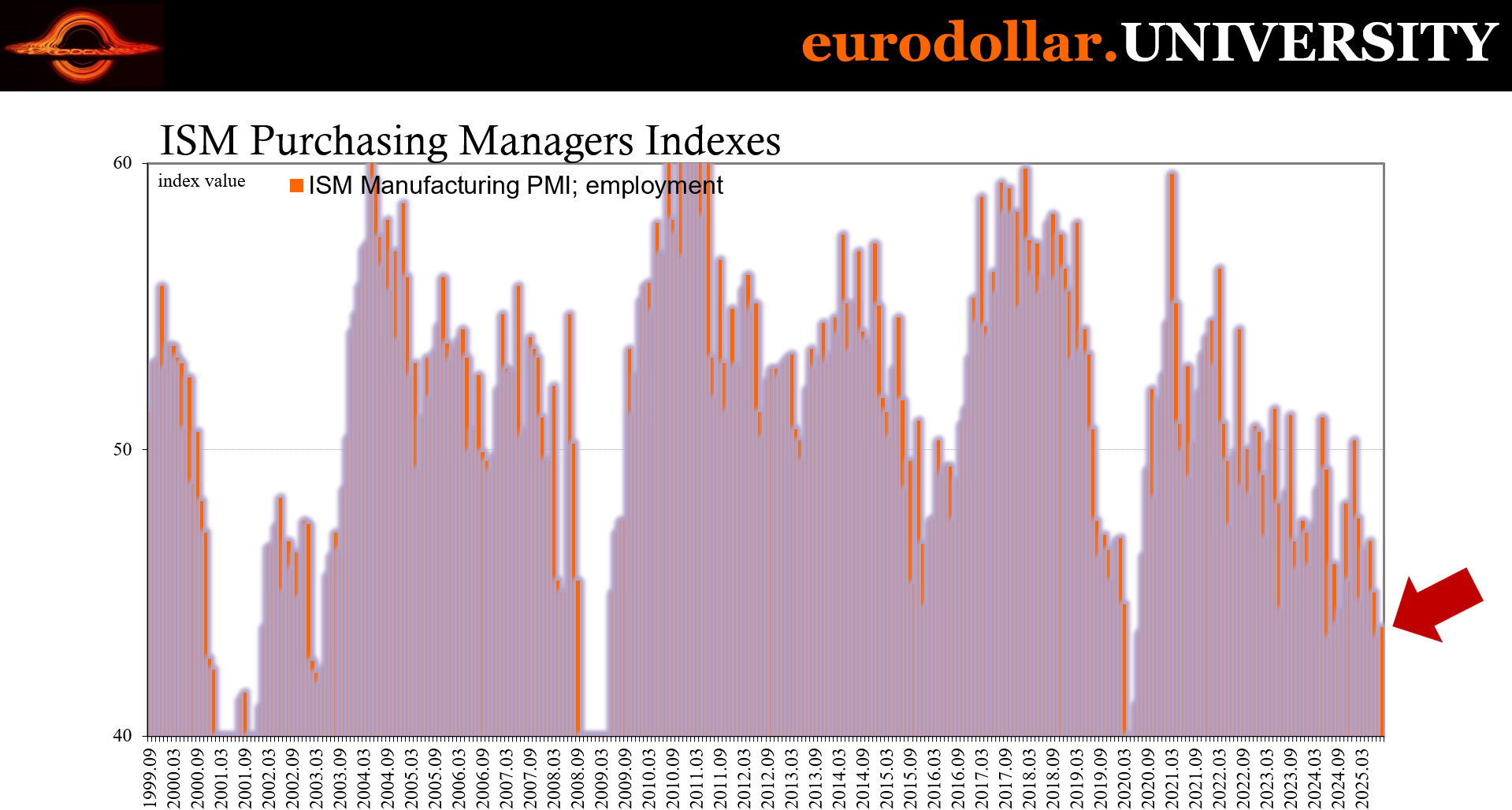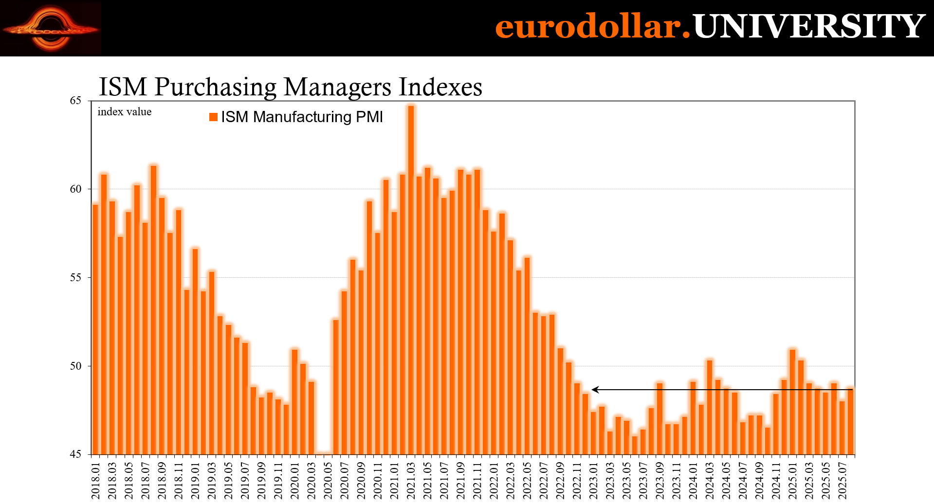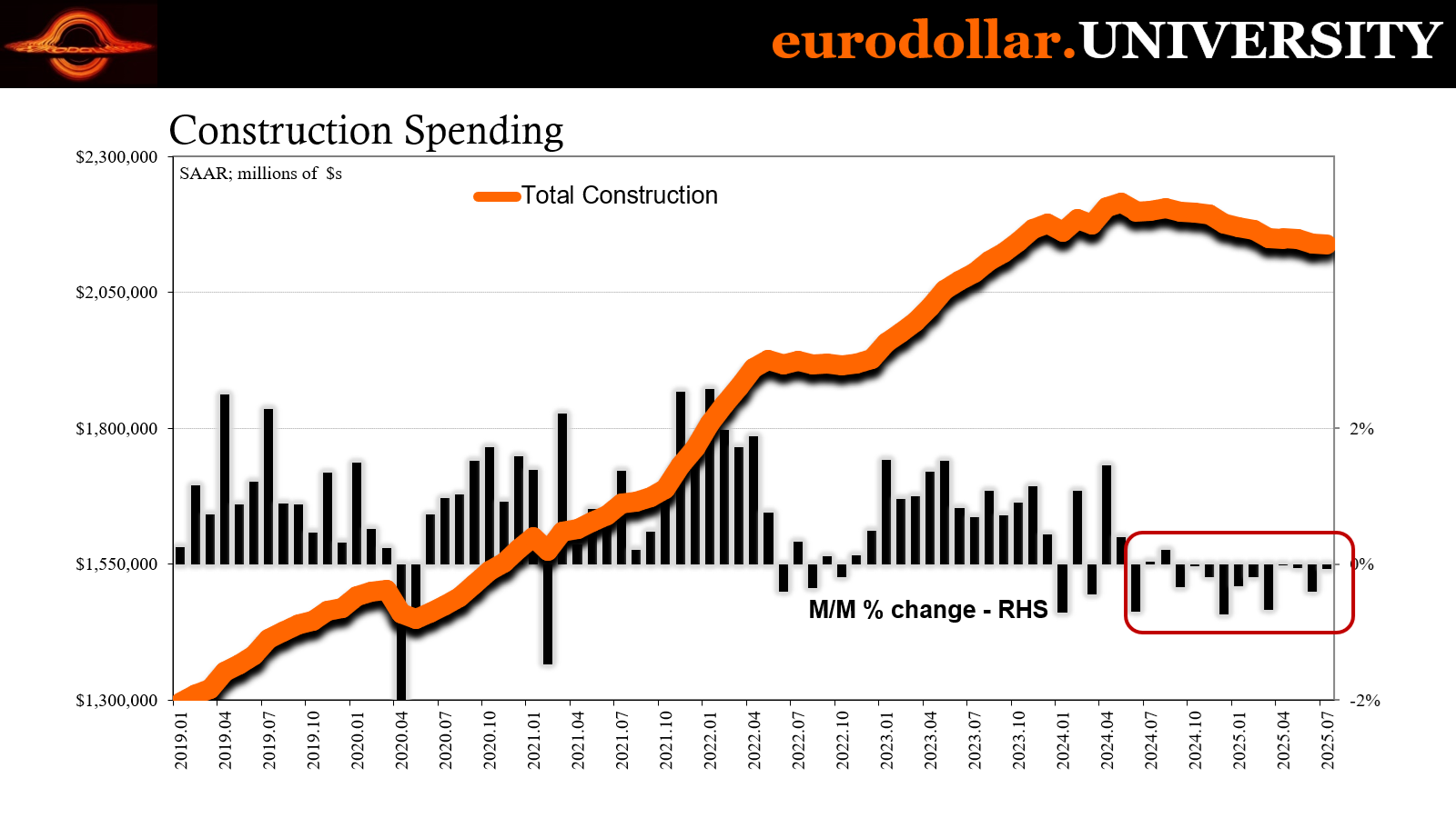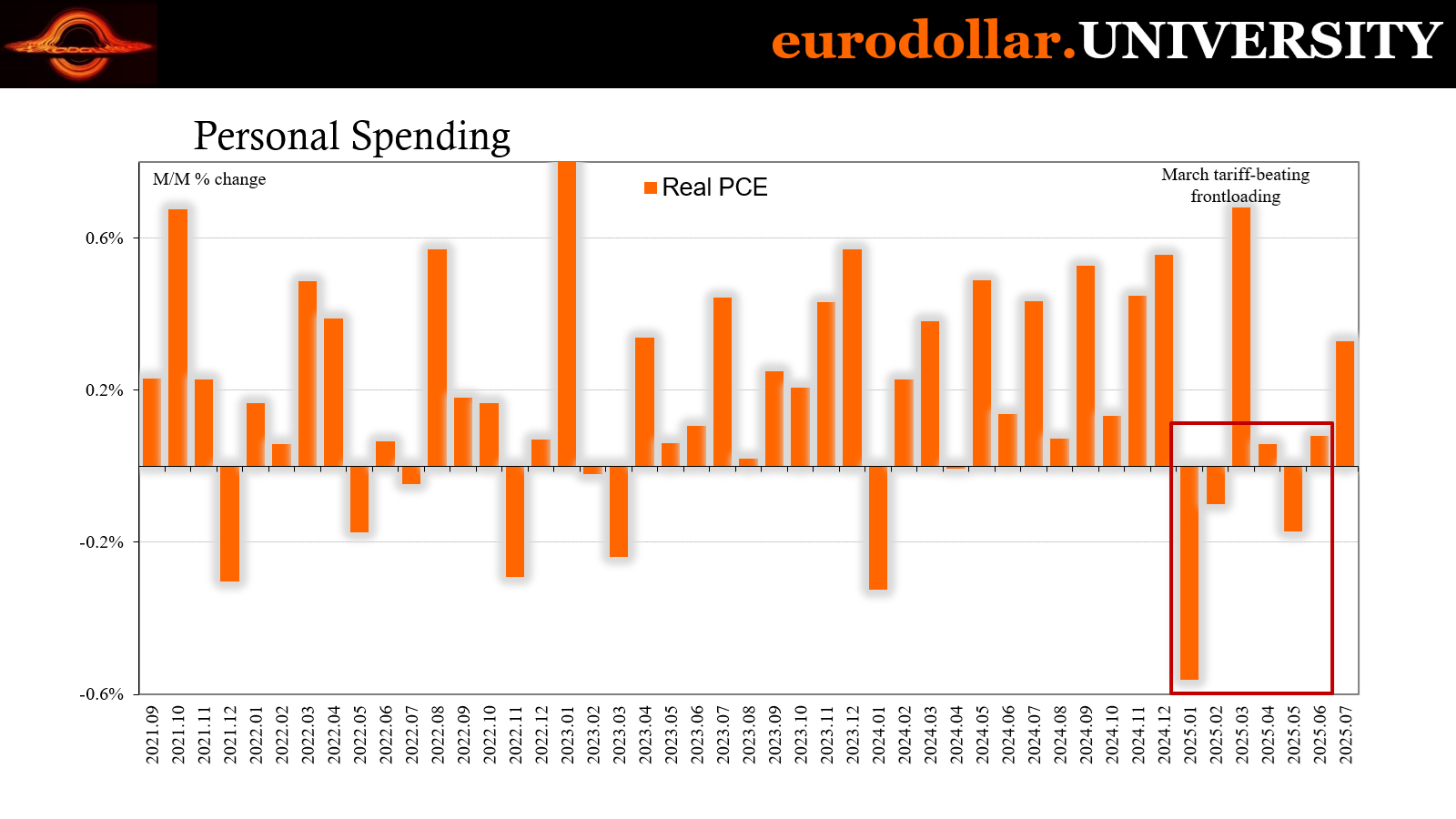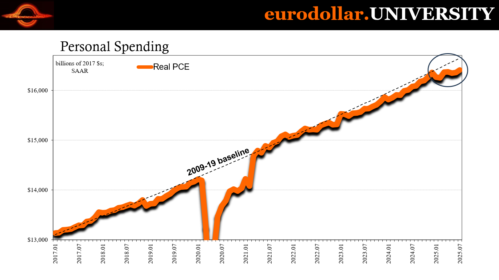 While real Personal Consumption Expenditures (PCE) managed to rebound in July (the latest data released last week), that came after three prior months of a standstill (meaning contraction) and the increase in July was created mainly by more tariff distortions. Consumers ran out to buy largely autos thinking that at some point their prices just have to rise, even if there is so far no evidence that will be the case.