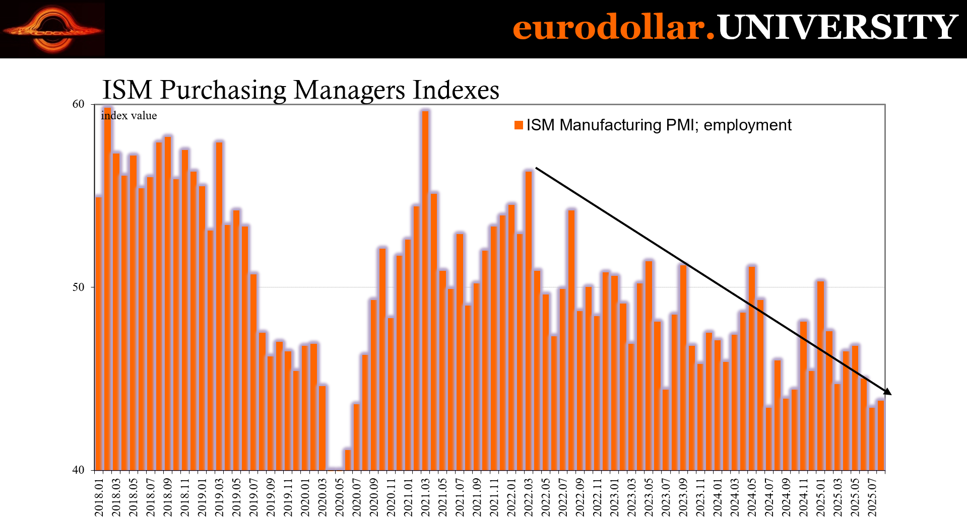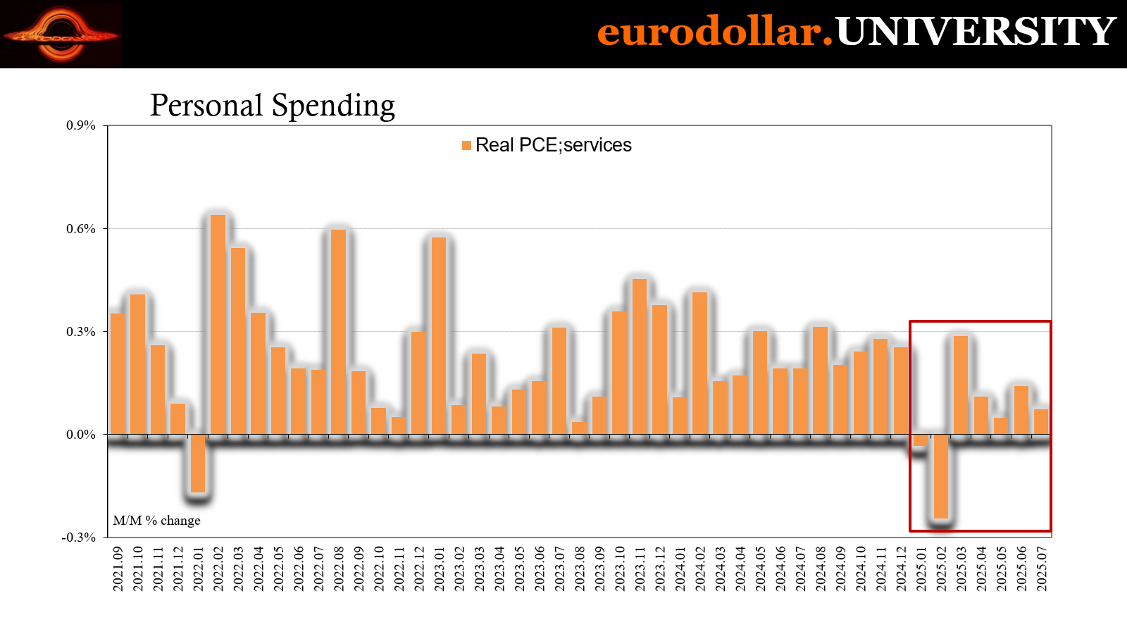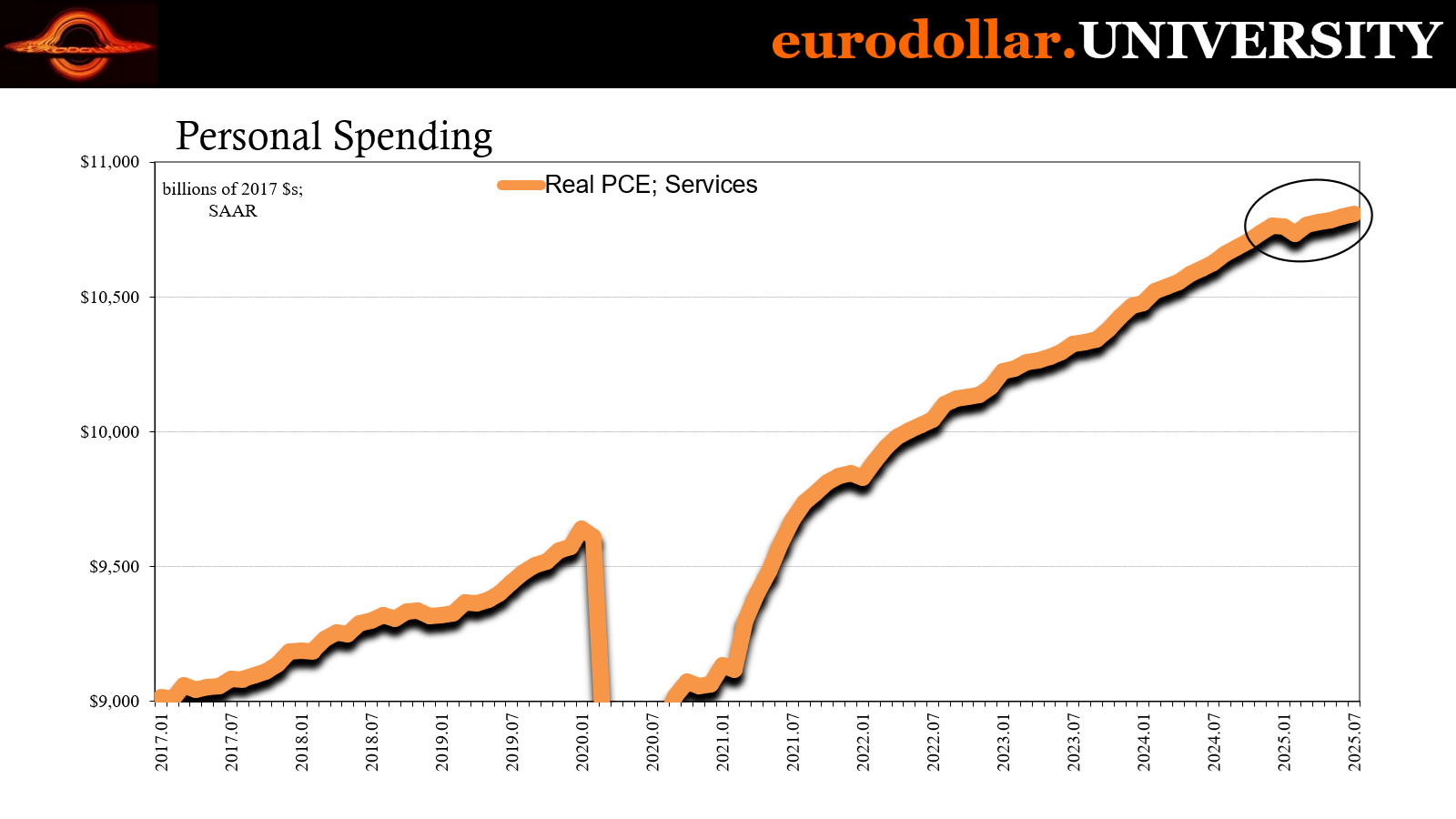 We can instead observe this baseline degradation in consumer behavior through the non-tariff distorted services sectors, the majority category for all PCE. There was no significant upturn in services outlays in July. In fact, all year, services spending has remained noticeably restrained and in contraction verifying the degree of labor difficulties as well as giving employers a reason to more fully explore flat Beveridge.
