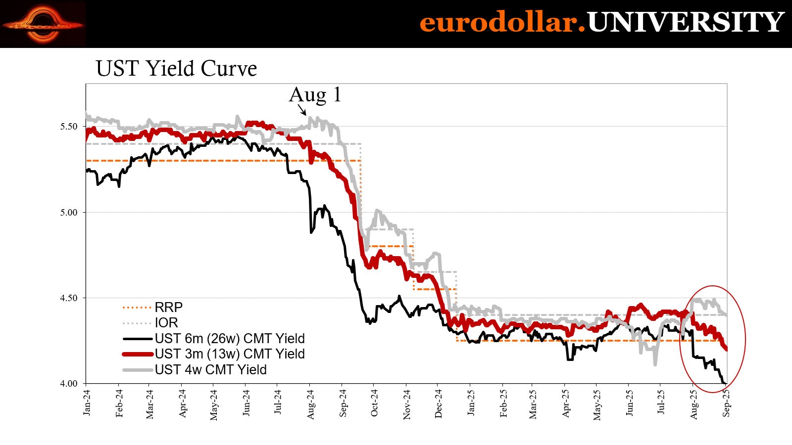 It's not that falling bill and term rates are driving the metal’s price, rather what those represent in a growing probability the FOMC doesn’t chicken out and pause any longer, plus the rising coincident chances the rate cut in September is just the beginning in the next series of Fed action getting the policy benchmarks far closer to that long run future of a lot lower rates for a lot longer.