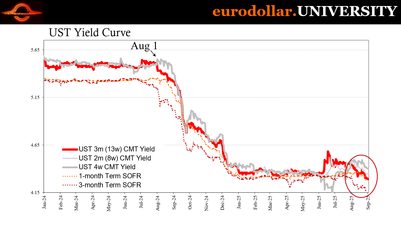 Alongside bills, term SOFR rates (these are what are supposed to substitute for term LIBOR rates; the 3-month term SOFR estimate is derived from term SOFR futures as an approximation for what 3-month LIBOR used to be, when term SOFR is definitely not that) have begun to shift, too. The 3m rate fell to 4.17% and even the 1m rate has dropped by roughly nine basis points going back to mid-August – not coincidentally the same timeframe as when gold began its current breakout.