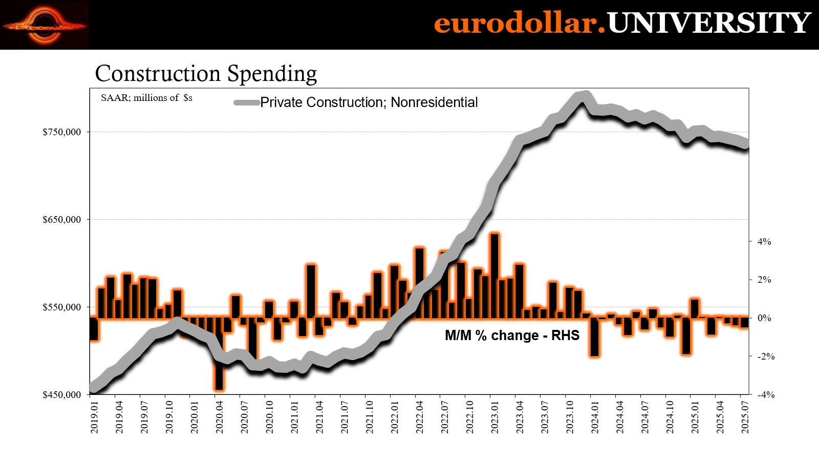 I’ve already covered construction spending and how it indirectly relates to employment; you can find that here. Census reported for July yet another decline in outlays, especially for private non-residential purposes. That’s the kind of capex retreat parallel to businesses also trimming labor utilization in one form or another, including, eventually, their number of payrolls.