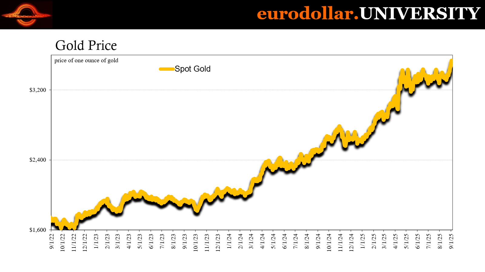 As the US returns from its Labor Day holiday, gold is – by far – the big winner from it. Stress in the US labor market, how fitting, has the Federal Reserve more than leaning back into the Pringles can. Markets are pricing more confidently the FOMC, led by lame duck Chair Powell, will not be able to chicken out. This week will have the JOLTS estimates (tomorrow), ADP, jobless claims, finally August payrolls and employment (or unemployment) come Friday.